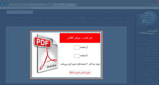 برای این کار کافی است بر روی عبارت «ذخیره این کتاب با فرمت PDF» کلیک کنید. بدین ترتیب پنجرهای باز میشود که کاربر میتواند محدوده صفحات مورد نظر خود را در آن مشخص کند.